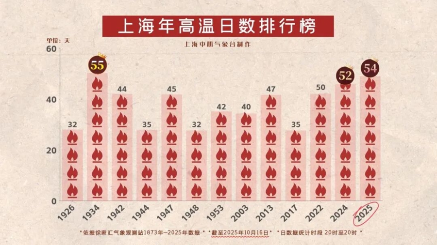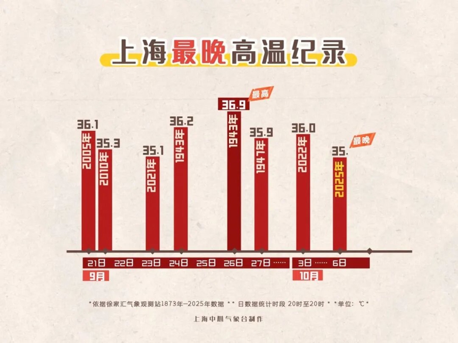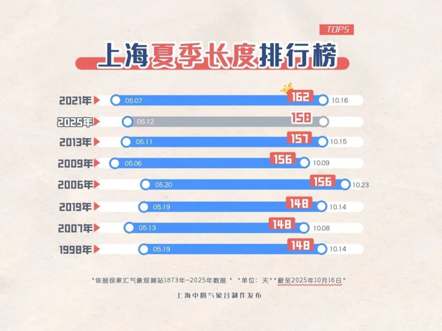 气象资料显示,5月12日入夏至今,上海今年夏季长度已达158天,是徐家汇站历史第二长的夏天。期间共出现54个高温日,为该站1873年以来高温第二多的夏天。10月6日中秋节当天最高气温35.0℃,创下了历史最晚高温纪录。