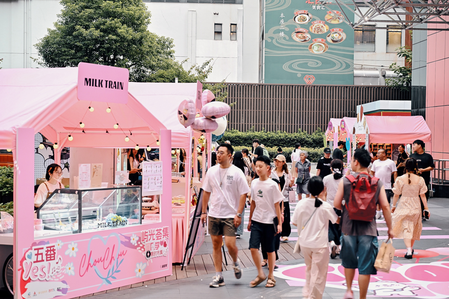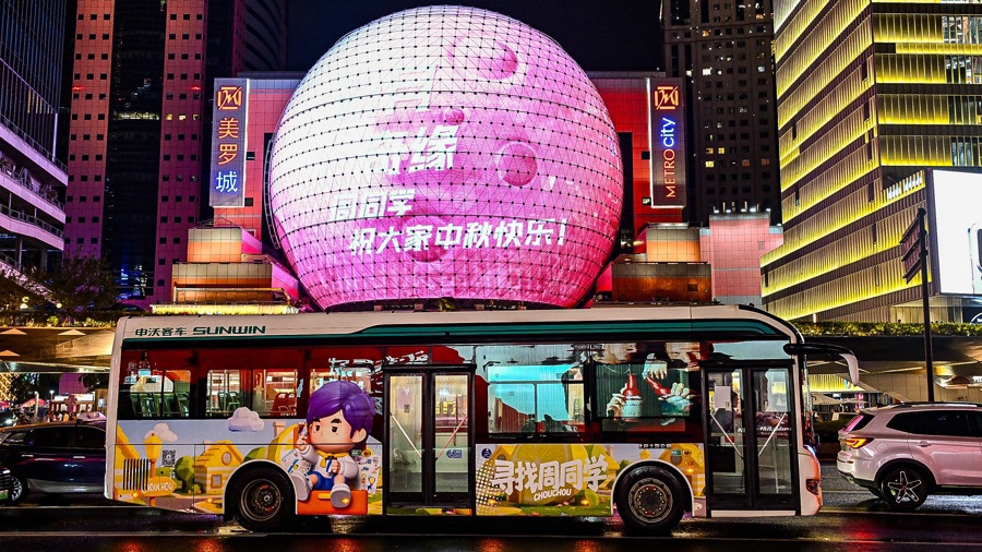 10月4日至7日,美罗城户外的巨型球体屏幕呈现“粉月奇缘”,“周同学”主题画面点亮夜空,成为上海中秋打卡的名场面。10月6日至12日举办的“屿光荟集·周同学限时市集”,提供“吃喝玩乐购”一站式体验,营造出浓厚的节日氛围。